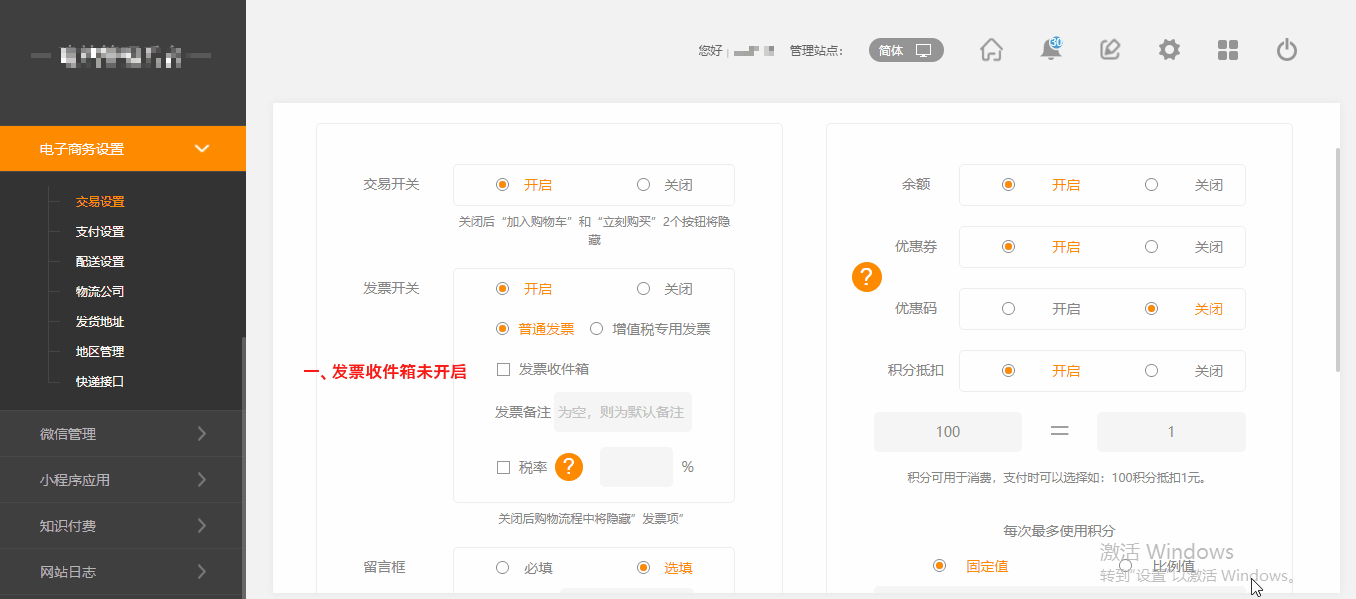 交易设置中能设置 交易开关和 币种及货币符号、积分抵扣、 库存计数、消费密码交易开关, 对营销版用户在此设置交易功能控制.1.依次点击后台管理-电子商务设置-》交易开关 1,交易开关,关闭后“加入购物车”和“立刻购买”2个按钮会隐藏显示。 2、当发票开关开启,需要开具发票的订单,系统将根据设置的税率计算税金,由买家承担。(税率计算不含运费) 3、积分可以用来消费,订单支付的时候用户可以选择使用积分...
